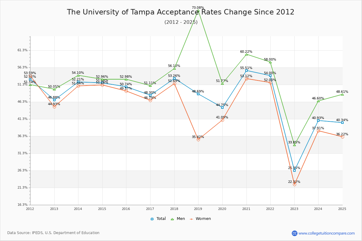 The overall acceptance rate for the university of tampa was reported as 44.7% in fall 2020 with over 24,400 applications submitted to ut.